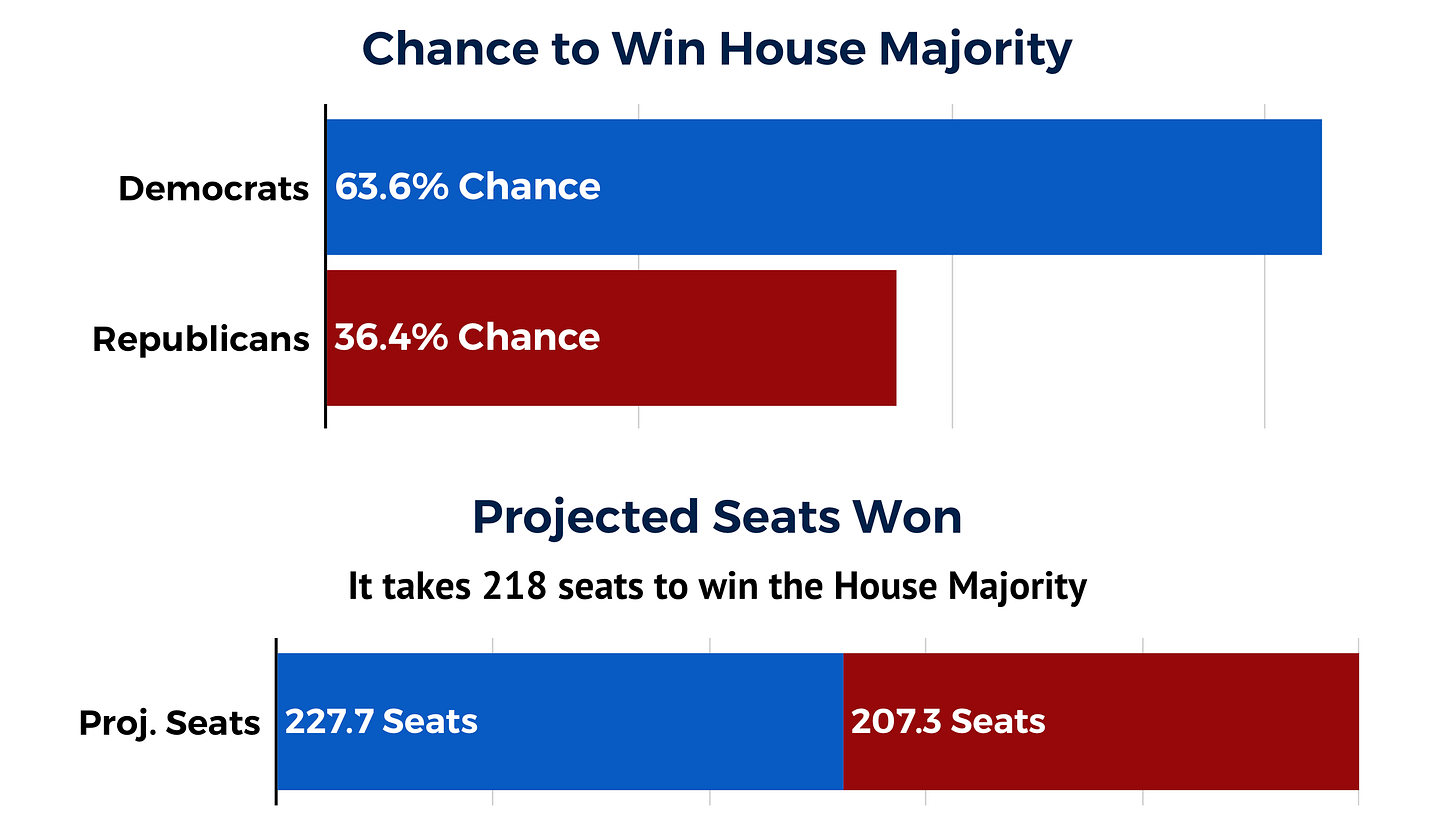 Le previsioni a un anno da un appuntamento elettorale valgono molto meno di quelle a ridosso delle votazioni, le quali valgono già poco più di zero. Le previsioni raccolte da RacetoTheWh.com, che fa una sintesi dei diversi sondaggi diffusi, parla di possibilità al 63,5% che i democratici vincano la House, con una proiezione superiore ai 225 seggi ottenuti.
